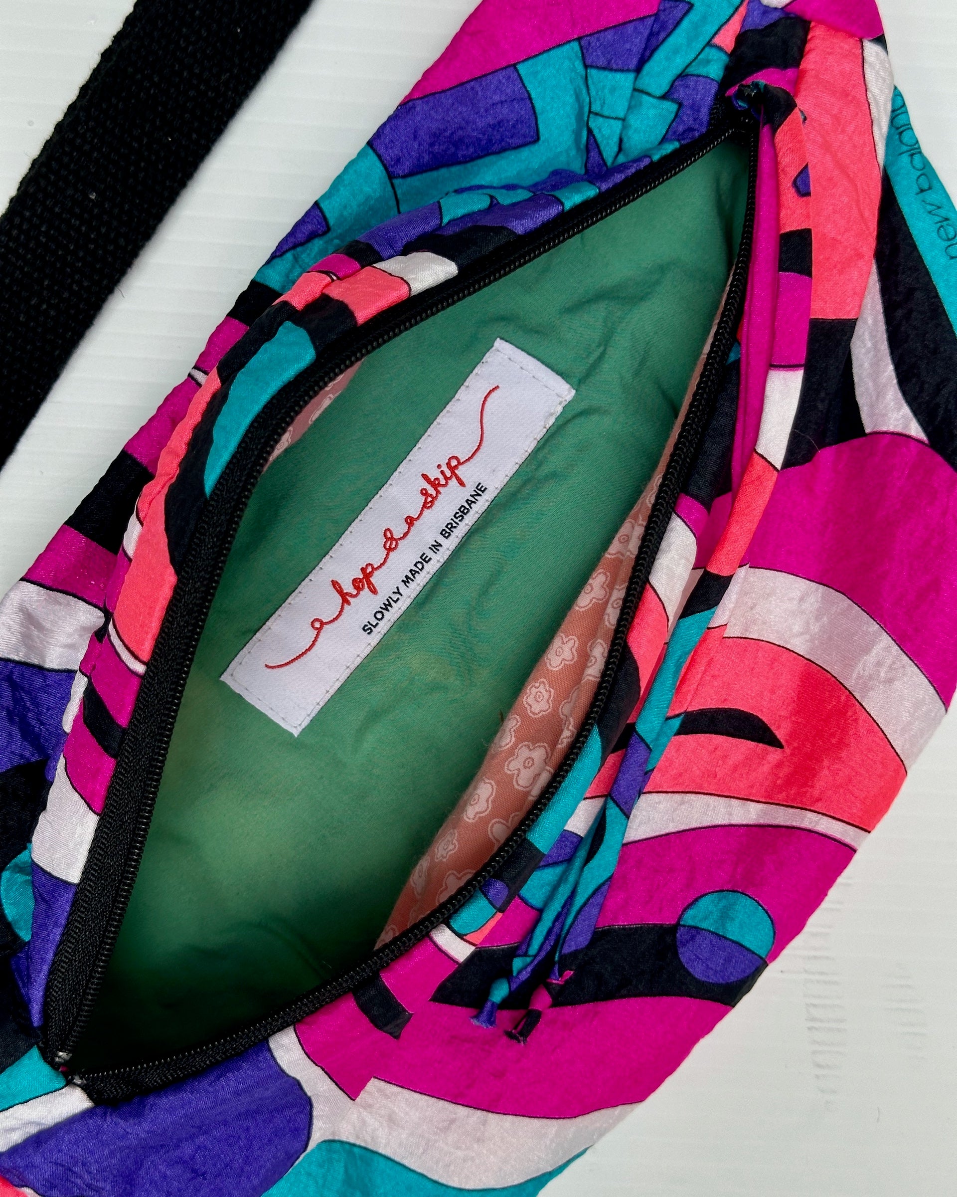 A thrifted New Balance windcheater in an electric mix of black, white, pink, coral, purple and teal gives this one-of-a-kind bumbag its unapologetically retro energy. Bursting with an 80s geometric print that feels delightfully Pucci-inspired, the fabric has that lightweight, slightly swishy texture that instantly evokes vintage sportswear, power walks, and neon-lit optimism.