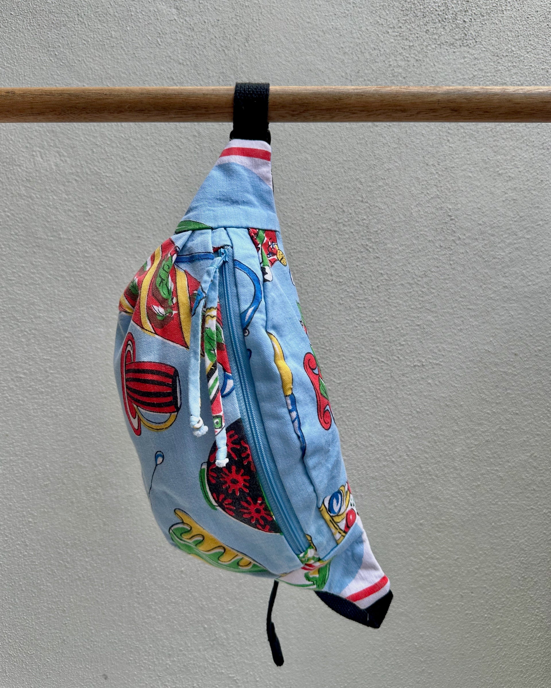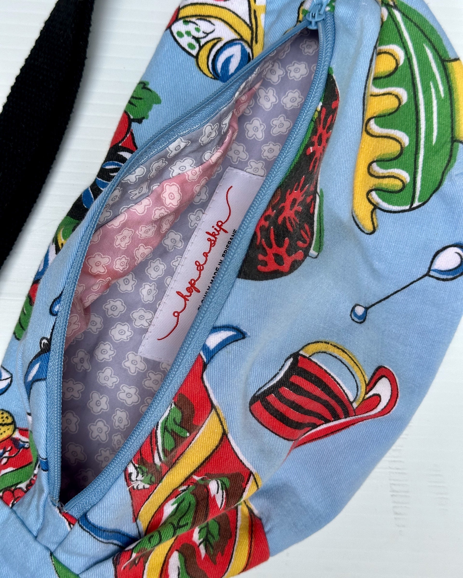 A thrifted teatowel with a cheerful blue background brings this one-of-a-kind bumbag to life. Tiny table settings, elegant crockery, and tempting treats turn everyday wear into a whimsical tea party.