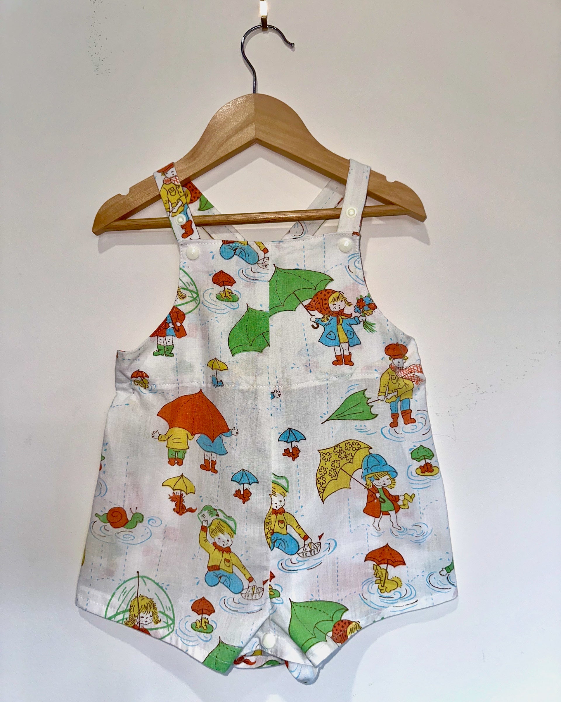 Sweet, soft and quietly nostalgic. Crafted from a vintage sheet featuring charming umbrella prints, this romper has a gentle, storybook feel made for slow days and little adventures.